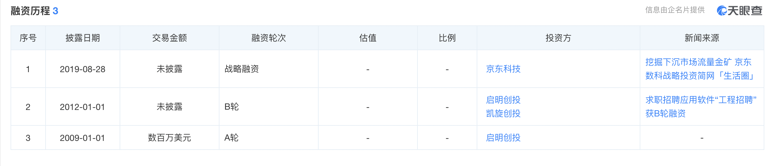 天眼查显示,简网生活圈隶属于北京简网世纪科技有限公司,于2011年由丁钧创办。是一家聚焦下沉市场本地生活社区的公司,将城市本地信息、求职招聘、二手市场、邻里论坛、生活服务等多种服务聚合,其业务覆盖河北、山东、河南、江苏、内蒙等多个省份。公司先后获得启明创投数百万美元A轮投资,启明创投和凯旋创投的B轮投资。2019年,其还获得京东数科战略投资。