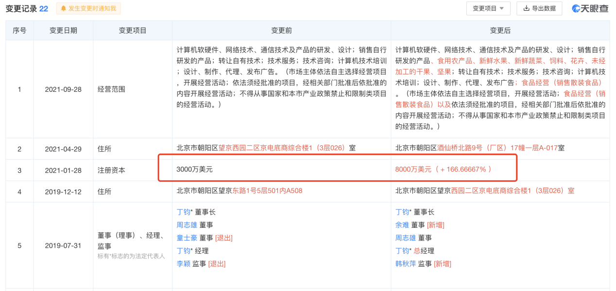 根据天眼查信息,今年1月28日,北京简网世纪科技有限公司注册资本由3000万美元增至8000万美元。今年9月,其经营范围增添了水果蔬菜等食品经营信息。