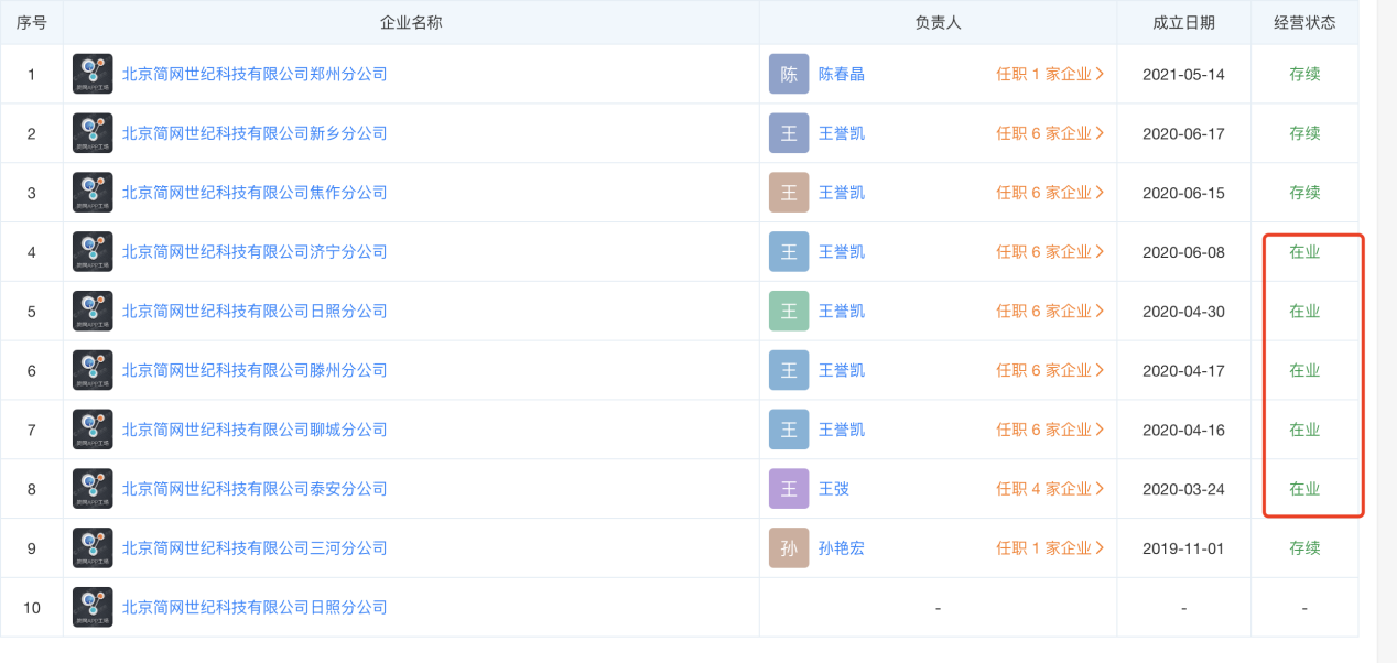 天眼查信息显示,济宁、日照、滕州、聊城、泰安等五个分公司处于在业状态,郑州等其余分公司皆为存续状态。