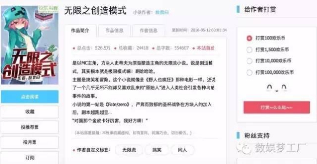 陈柄烨告诉数娱梦工厂,从2015年8月上线至今,欢乐书客已经累积了规模为7000本的书库,作者4000人以上,注册用户超20万,日活用户超5万,已经形成了自循环。在商业模式方面,欢乐书客和其他小说平台一样,同样采用内容收费分成与IP改编授权的盈利模式,并且已靠内容收费分成实现盈利。