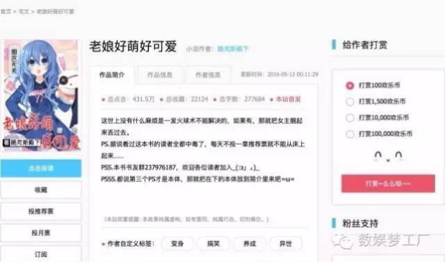 “目前欢乐书客平台上的作者大都还停留在无限流阶段,但从上月开始,已经有成熟的原创作品产生。例如四月首发的《老娘好萌好可爱》,上线伊始便取得首订3600的好成绩(首订为24小时内第一章VIP的订阅次数,是检验作品人气的第一个指标,首订3600预示着作者在正常更新情况下纯稿费收入已经过万)。在这个过程中,我们会逐步探索出属于中国本土化的二次元网文形态。”陈柄烨表示。