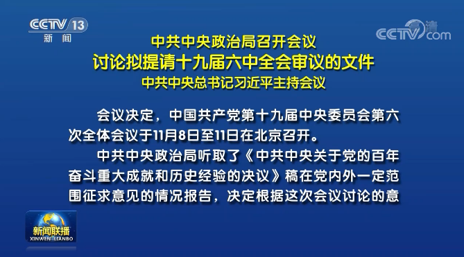 会议决定,中国共产党第十九届中央委员会第六次全体会议于11月8日至11日在北京召开。