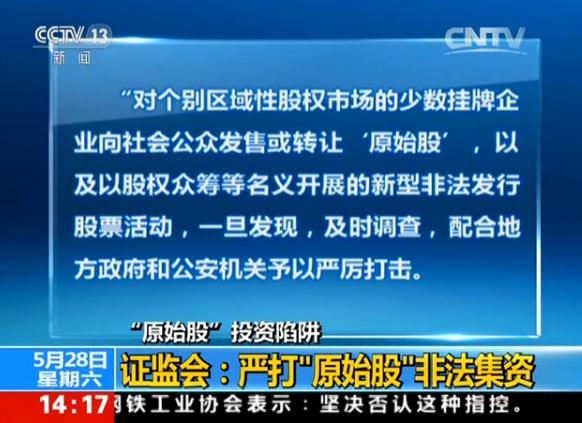针对社会上目前存在的兜售原始股的现象,最近,国家防范和处置非法集资部际联席会议成员14个部委在北京召开座谈会,证监会相关人士表示,对于对个别区域性股权市场的少数挂牌企业向社会公众发售或转让‘原始股’为名进行非法集资,证监会将进行严厉打击。区域性股权市场挂牌企业需严格按照私募方式募集资金。
