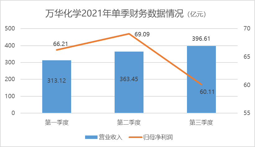 分季度看,万华化学今年单季营收均超过300亿元,且逐季递增。然而,第三季度公司实现归属于上市公司股东的净利润仅为60.11亿元,虽仍居高位,但与前两个季度单季66.21亿元和69.09亿元相比已有逊色。尤其是在第三季度营业收入超过第二季度约33亿元,超过第一季度约88亿元的前提下。