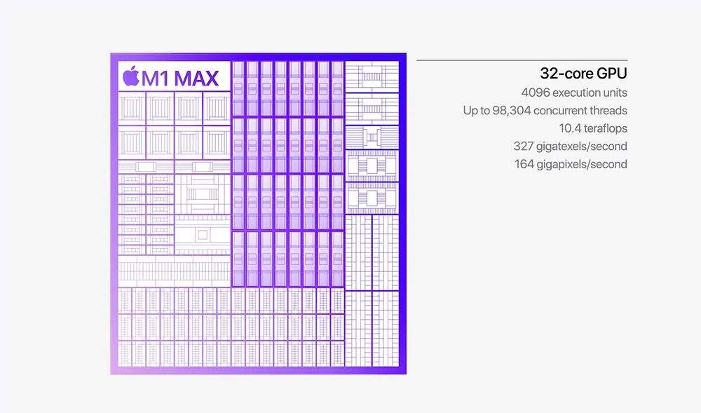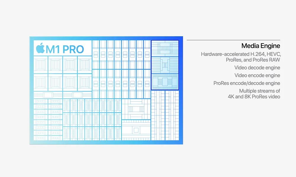 M1 Max的GPU提升到32核,相比M1性能提升了4倍,Media Engine模块也有所增加,处理视频能力更强。