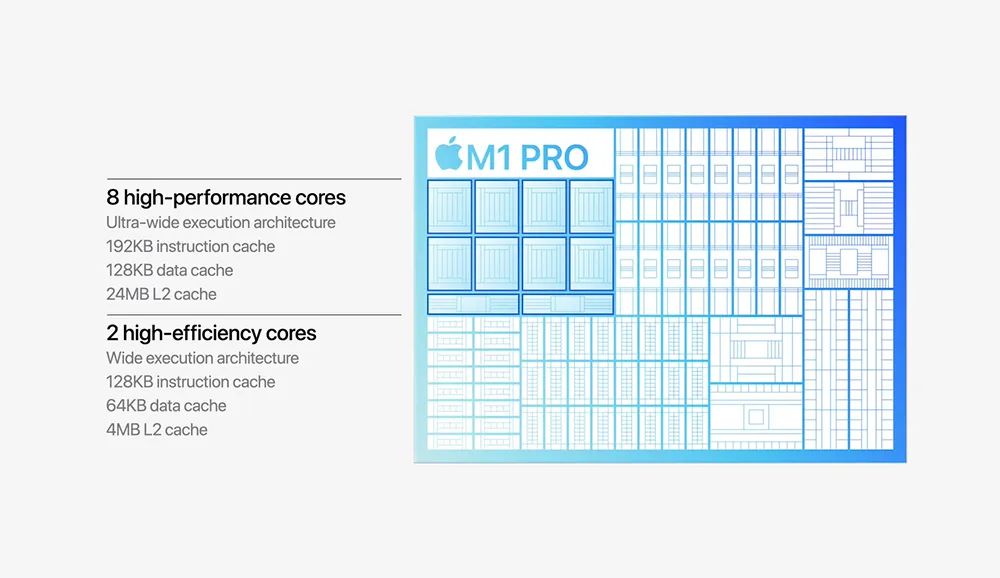 M1 Pro和M1 Max在CPU部分相同,均具有10核CPU,分别为8个高性能核心和2个高效能核心,据称相比M1有70%性能提升。
