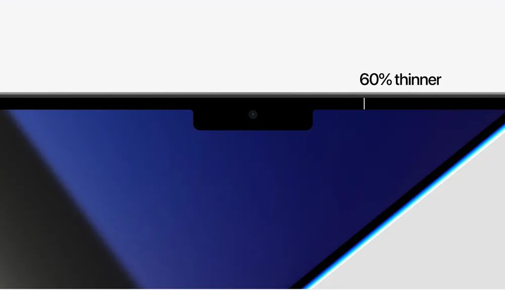 在屏幕方面,MacBook Pro的屏幕边框收窄24%至3.5mm,顶部也收窄了60%,但因为要保留摄像头区域而留下了一个“刘海”,这也是MacBook系列产品首次采用刘海全面屏设计。