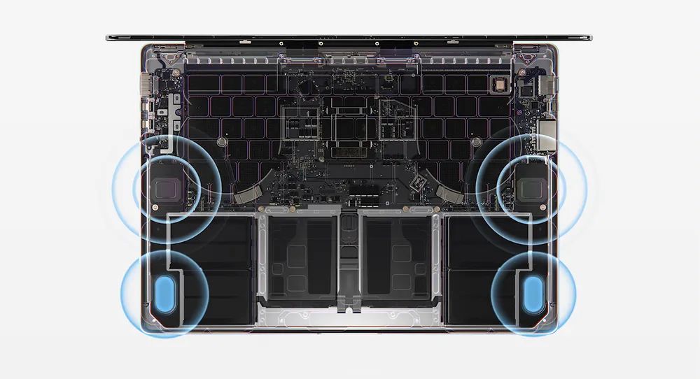 音频方面,MacBook Pro的麦克风降噪能力提升了60%,搭载了6个扬声器单元,高音单元增加了2倍,低音单元也增大,低音多了80%。MacBook Pro支持杜比全景声和六音频单元的空间音频。