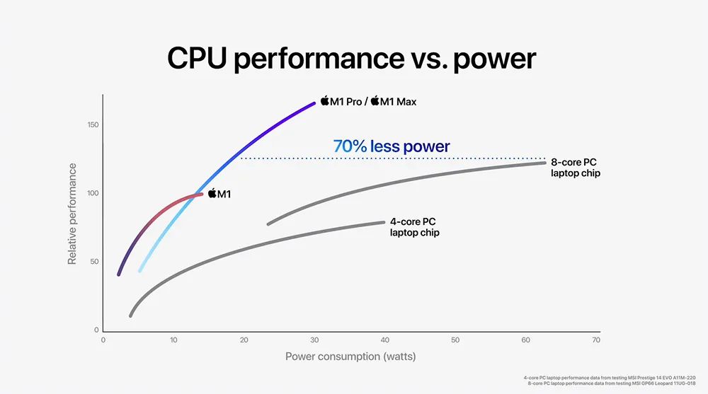 在CPU性能方面,M1 Pro和M1 Max的峰值性能能达到这些8核竞品PC芯片的1.7倍,同样性能,功耗则少了70%。