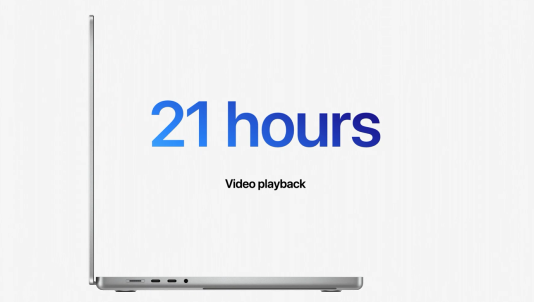 在续航方面,电池续航在某些应用中最多提升了2倍,16英寸MacBook Pro播放视频时间可以达到21小时,充电速度则可以在30分钟充电到50%的电量。