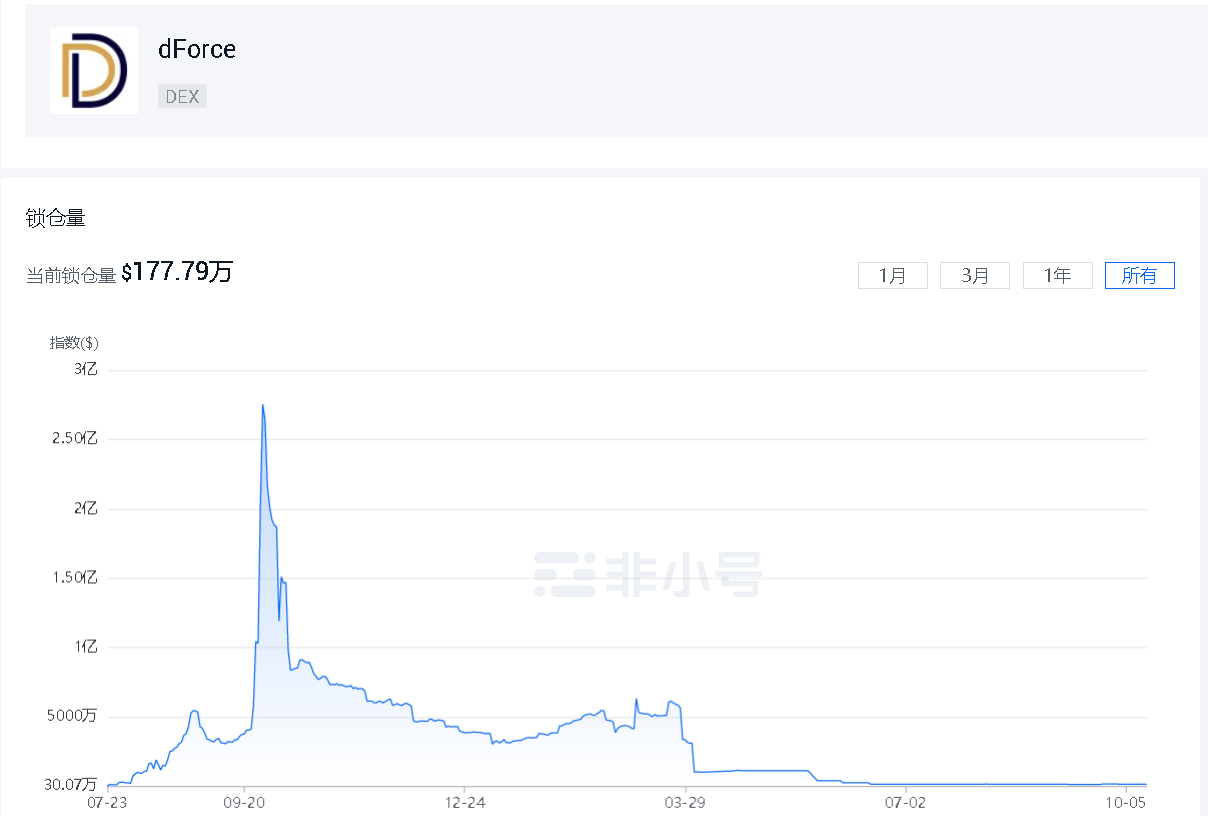 事件发生后,dforce这款在DeFi上运行的去中心化借贷,资金池锁仓量由最高点2.5亿美元锁仓量,下跌至177万美元,从最高点到最低点只用了不到6个月的时间。