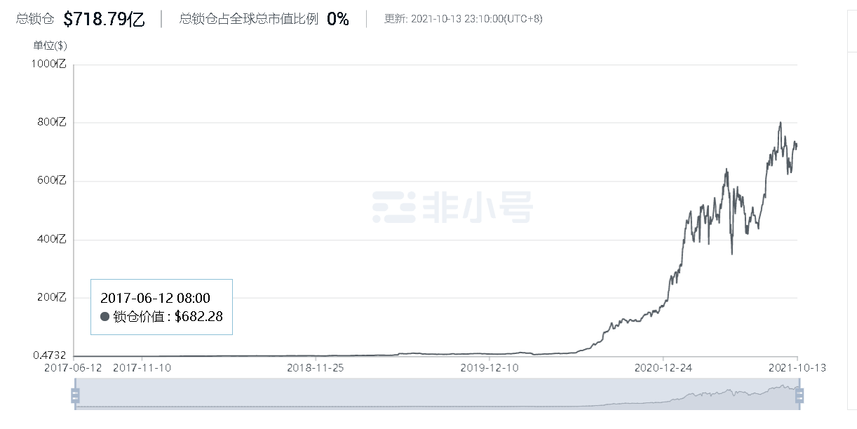 2017年6月,DeFi的概念刚被提出,整个加密货币市场DeFi资金池的锁仓量为682美元,这是DeFi资金池才被创造出来时的数据。