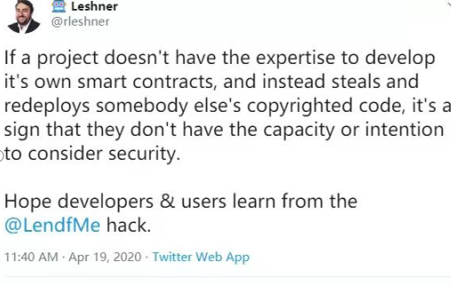 在dforce被盗一事发生后,去中心化平台compound创始人发布推特表示“如果一个项目无法足够专业,无法构建自己的智能合约,而是直接复制源代码,在智能合约的基础上稍做修改,那么他们实际没有成为DeFi安全审查的能力,希望大家从dforce的事件中吸取教训”。