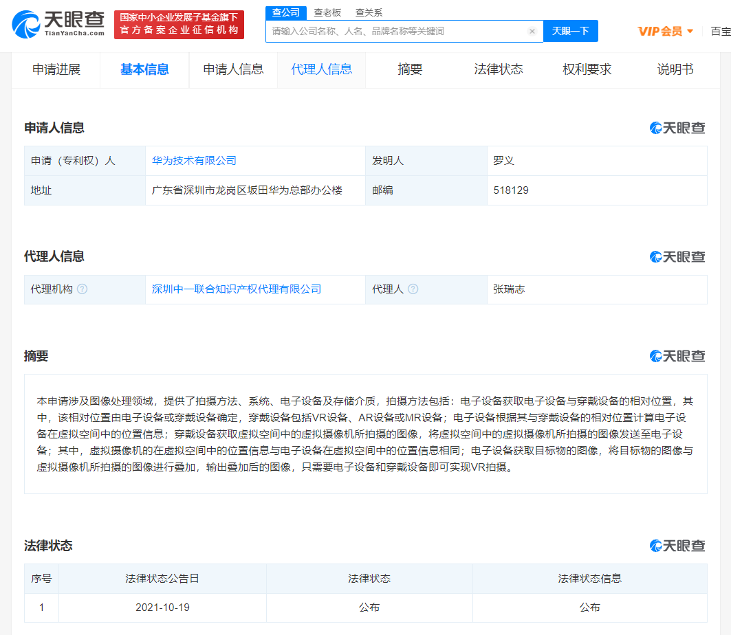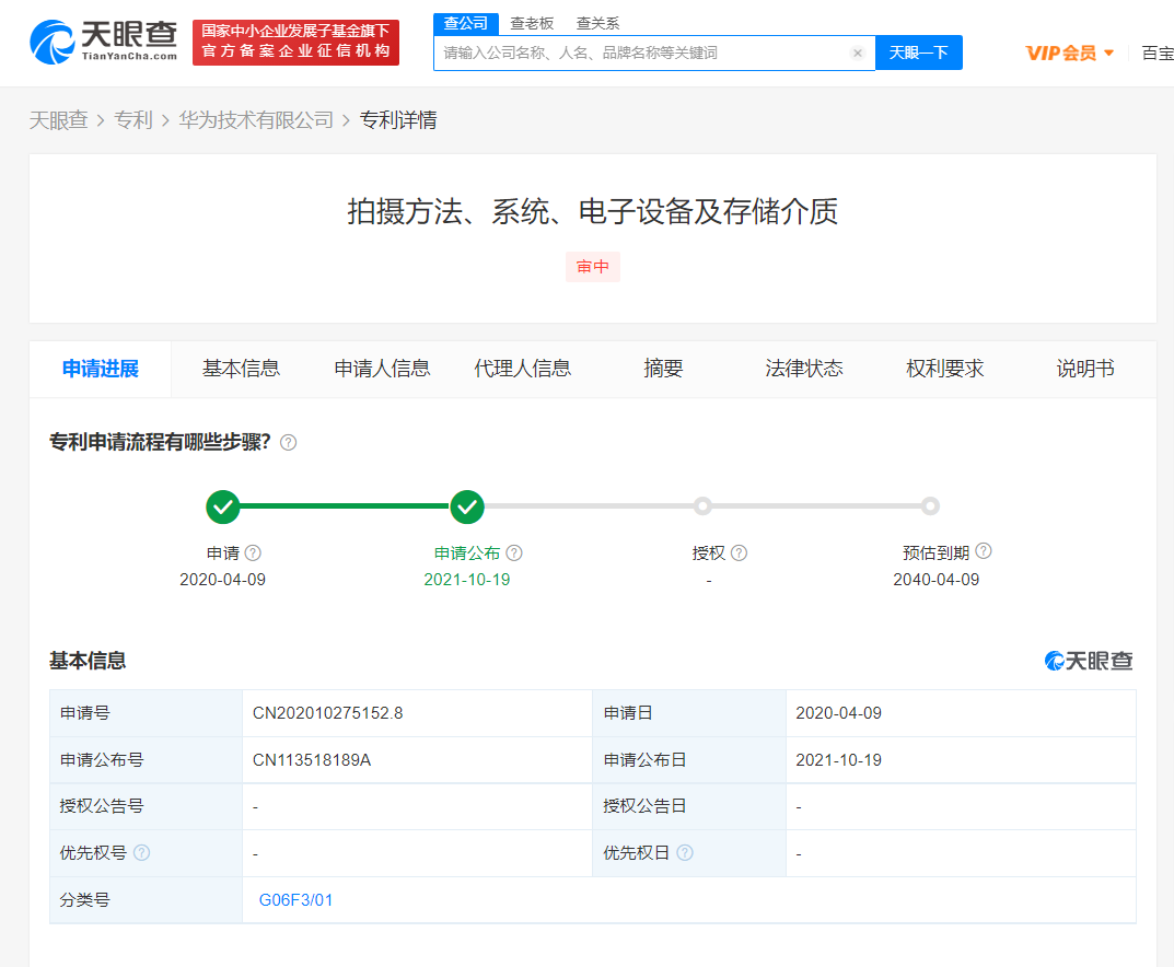 据天眼查APP显示,10月19日,华为技术有限公司公布了“拍摄方法、系统、电子设备及存储介质”专利,申请公布号为CN113518189A。