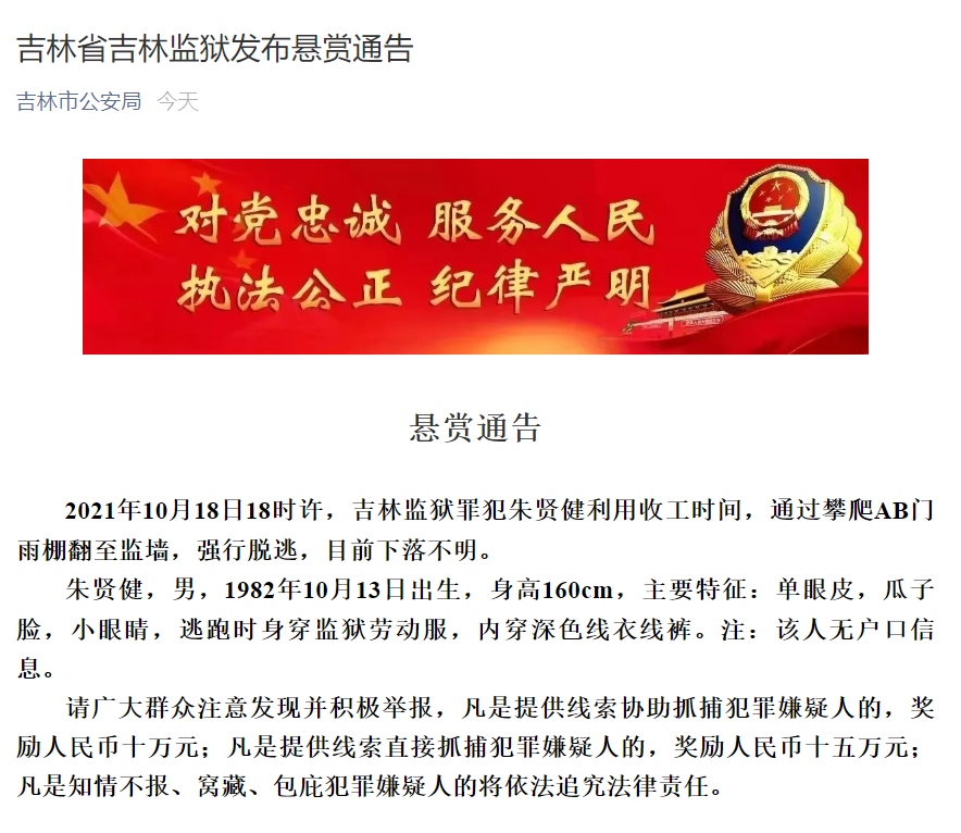 2021年10月18日18时许,吉林监狱罪犯朱贤健利用收工时间,通过攀爬AB门雨棚翻至监墙,强行脱逃,目前下落不明。