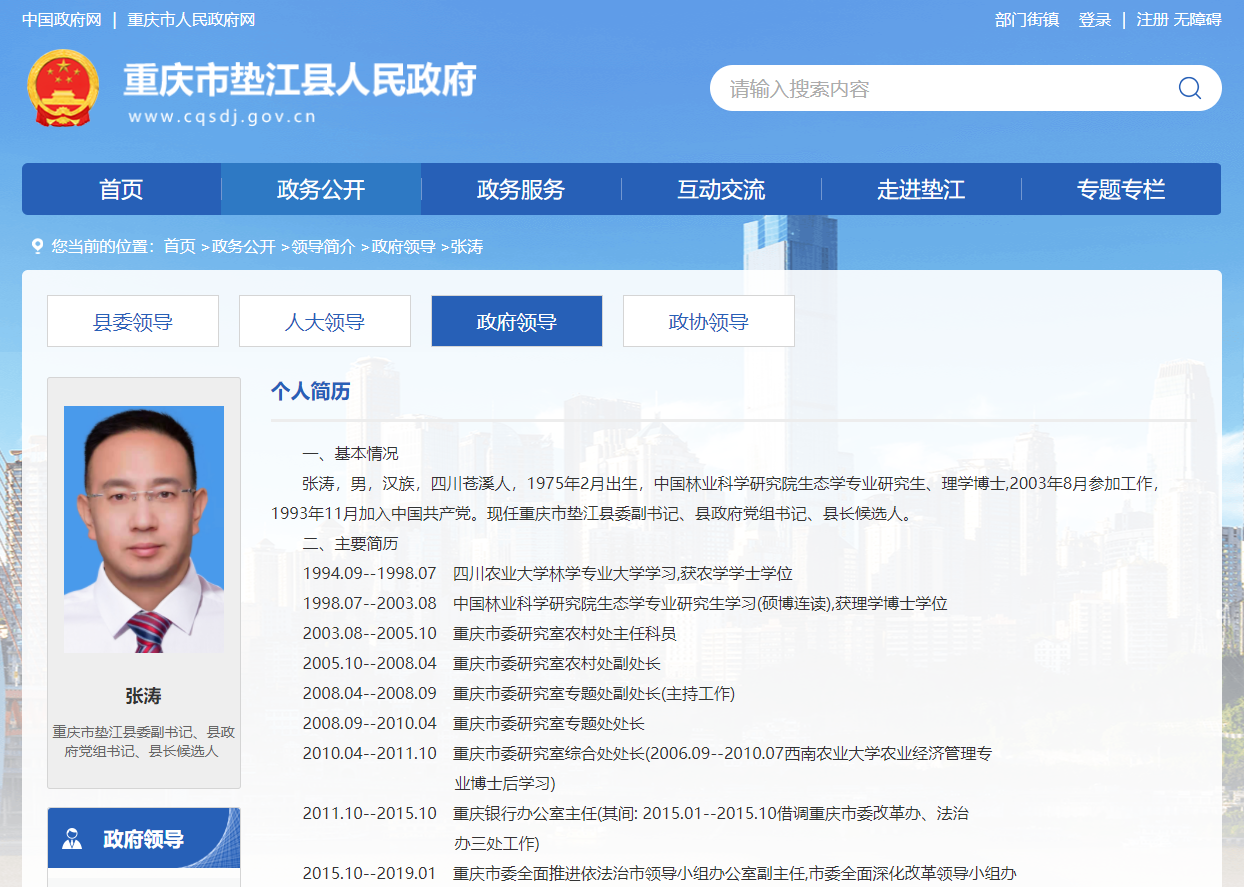 据重庆市垫江县人民政府网站“政府领导”栏目更新显示,张涛现任重庆市垫江县委副书记、县政府党组书记、县长候选人。