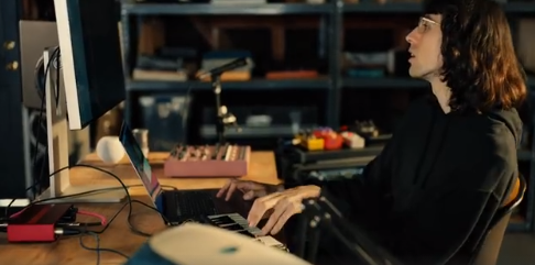 主题被命名为“来炸场”的发布会,第一个镜头就很炸,私家车库中,一位身穿蓝色牛仔裤和黑色帽衫,戴眼镜,留着嬉皮士中长卷发的男青年(形似青年时期的乔布斯),将一台iMacG3摆放在形似宜家LACK的黑色边桌上,用数据线将它同右侧电脑桌上的Mac笔记本连在一起。