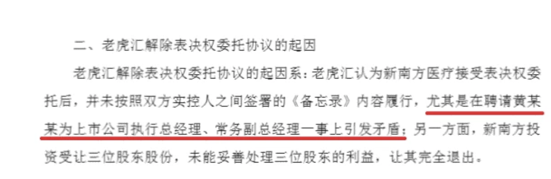 回复涵公告称,老虎汇认为新南方医疗接受表决权委托后,并未按照双方实控人之间签署的《备忘录》内容履行,尤其是在聘请黄利兵为上市公司执行总经理、常务副总经理一事上引发矛盾;另一方面,新南方投资受让三位股东股份,未能妥善处理三位股东的利益,让其完全退出。