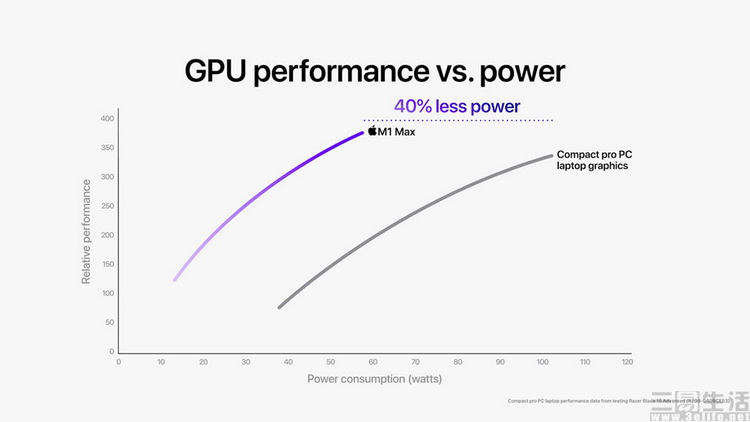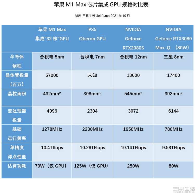 但是这里就产生了一个问题,如果根据M1 Max和M1 Pro的功耗差值来推算,将不难得出,M1 Max的GPU功耗最高不会超过70W(这还是多算了一个媒体引擎在里面,实际应该更低)。而它的三个对比对象的功耗,却分别达到了250W、80W和125W左右(PS5是180W SoC设计,但其CPU规格基本等同于桌面版65W的Zen2 APU)。