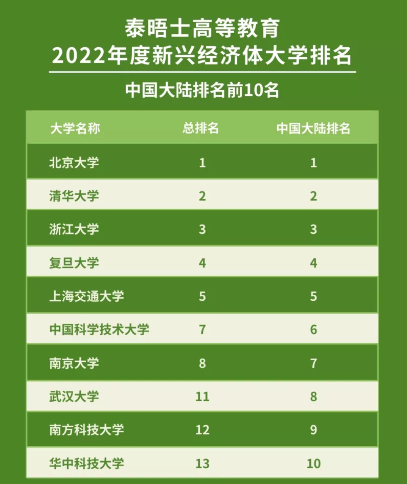 10月20日,泰晤士高等教育(THE)发布2022年度新兴经济体大学排名。北京大学、清华大学、浙江大学、复旦大学、上海交通大学、中国科学技术大学和南京大学共七所中国大陆高校进入榜单前十位。