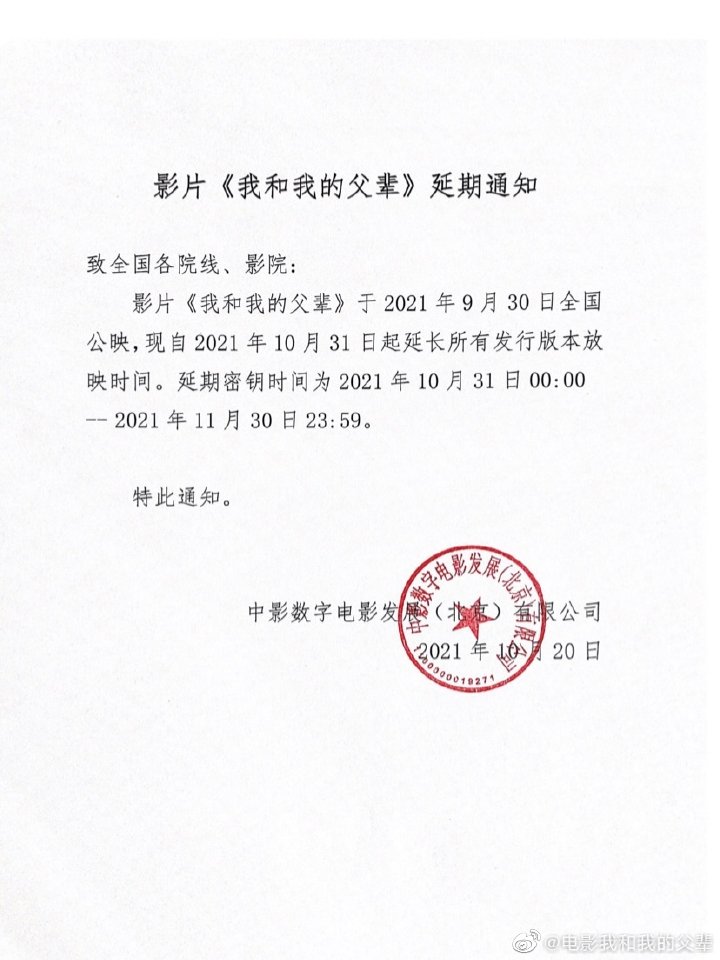 据@电影我和我的父辈 微博10月20日消息,影片《我和我的父辈》于2021年9月30日全国公映,现自2021年10月31日起延长所有发行版本放映时间,将延长放映至2021年11月30日。