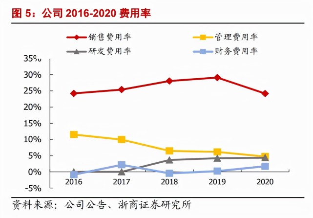 公司销售费用率在2020年以前一直攀升,从25%升至30%,但在2020年有明显回落;研发费用率从2019年至2020年一直保持在5%左右。