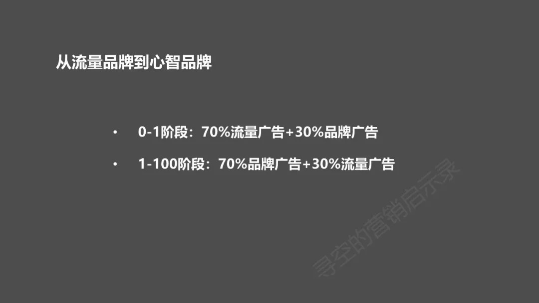 总体来讲,当新消费品牌处于0-1的阶段时,可以以流量广告为主,当品牌处于1-100阶段时,则需要以品牌广告为主,最终让品牌从流量品牌转向心智品牌。