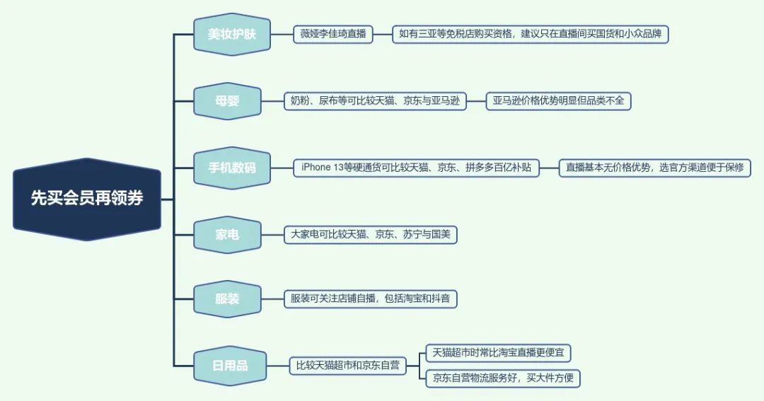 在直播间买东西最重要的是保持理性,不买计划外的产品,并进行多平台比价,母婴产品可以比较天猫、京东与亚马逊,亚马逊价格优势明显但品类不全,决定蹲亚马逊的话可以等黑五;手机数码产品可以比较天猫、京东与拼多多百亿补贴,淘宝直播等直播平台基本无价格优势,拼多多百亿补贴也需要先抢到抵价券,iPhone 13的抵价券极大可能是秒空;大家电可比较天猫、京东、苏宁与国美,如果是装修这种大需求,有时苏宁、国美的线下打包价会更划算;服装品类最便宜的并不是双11,最大力度一般放在上新或店庆日,所以双11可关注店铺自播,除了淘宝外,还可关注抖音这个渠道;日用品可比较天猫超市和京东自营,前者的平日价格经常会比直播间更便宜,而京东自营物流服务好,基本都要求送货上门,所以购买纸巾、储物盒等大件时省去了快递点自提的麻烦。