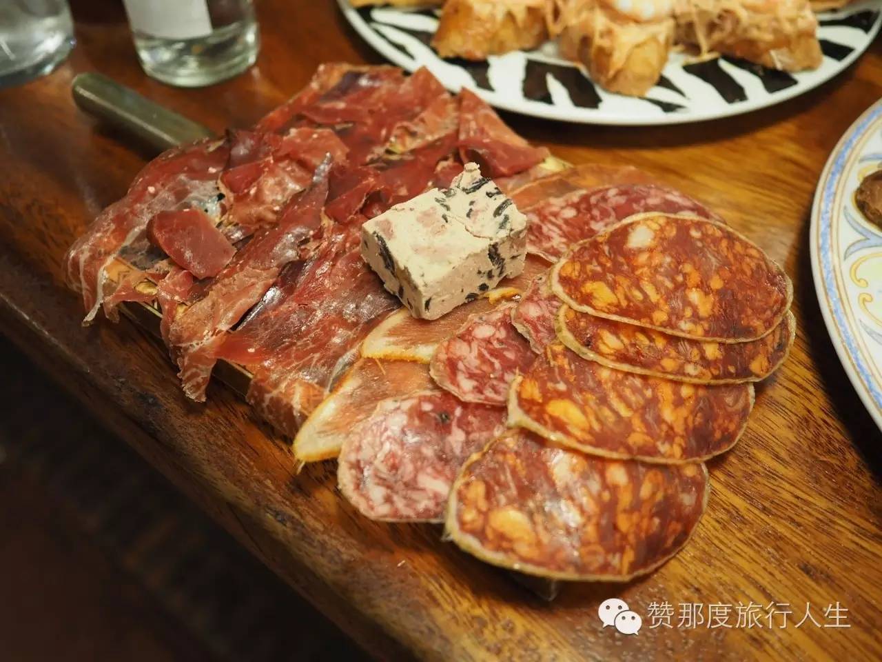 巴斯克乡村风格的Pintxos Bar,气氛怀旧。诱人伊比利亚火腿悬挂在吧台上方,宣告着本店的肉食主题,让认迫不及待得点上一份香肠拼盘或火腿Pintxos开始大快朵颐。