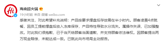 10月20日,海底捞通过官方微博补充说明,称产品按照要求摆盘后存放需要在半小时内,顾客于当天凌晨4点就餐,因员工提前摆盘后放入冻库保存,由于产品特性导致水分流失,属于操作失误,已加强整改。