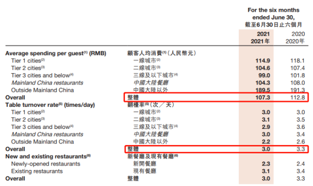 财报显示,今年上半年海底捞整体翻台率降至3次/天。同时,顾客人均消费支出同比也出现下跌,由去年同期的112.8元降至上半年的107.3元。