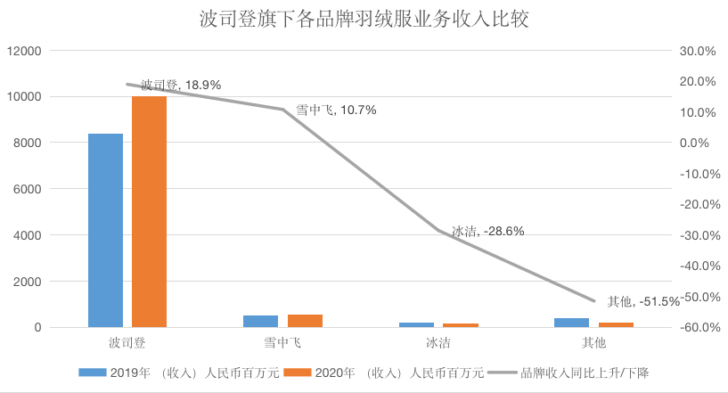 从产品来看,2020财年,中高端定位的波司登品牌,羽绒服收入为99.94亿元,同比增长18.9%,贡献了收入的九成以上,主打性价比品牌雪中飞与冰洁收入分别是5.52亿元、1.47亿元,占比分别为5.1%和1.3%,分别同比增长10.7%,下降28.6%。