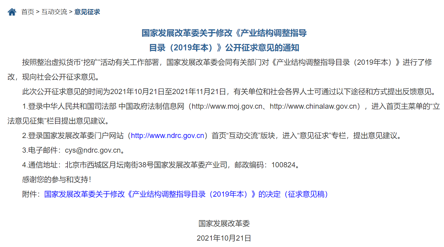 据发改委网站10月21日消息,发改委就修改《产业结构调整指导目录(2019年本)》公开征求意见:在《产业结构调整指导目录(2019年本)》淘汰类“一、落后生产工艺装备”“(十八)其他”中增加第7项,内容为“虚拟货币‘挖矿’活动”。
