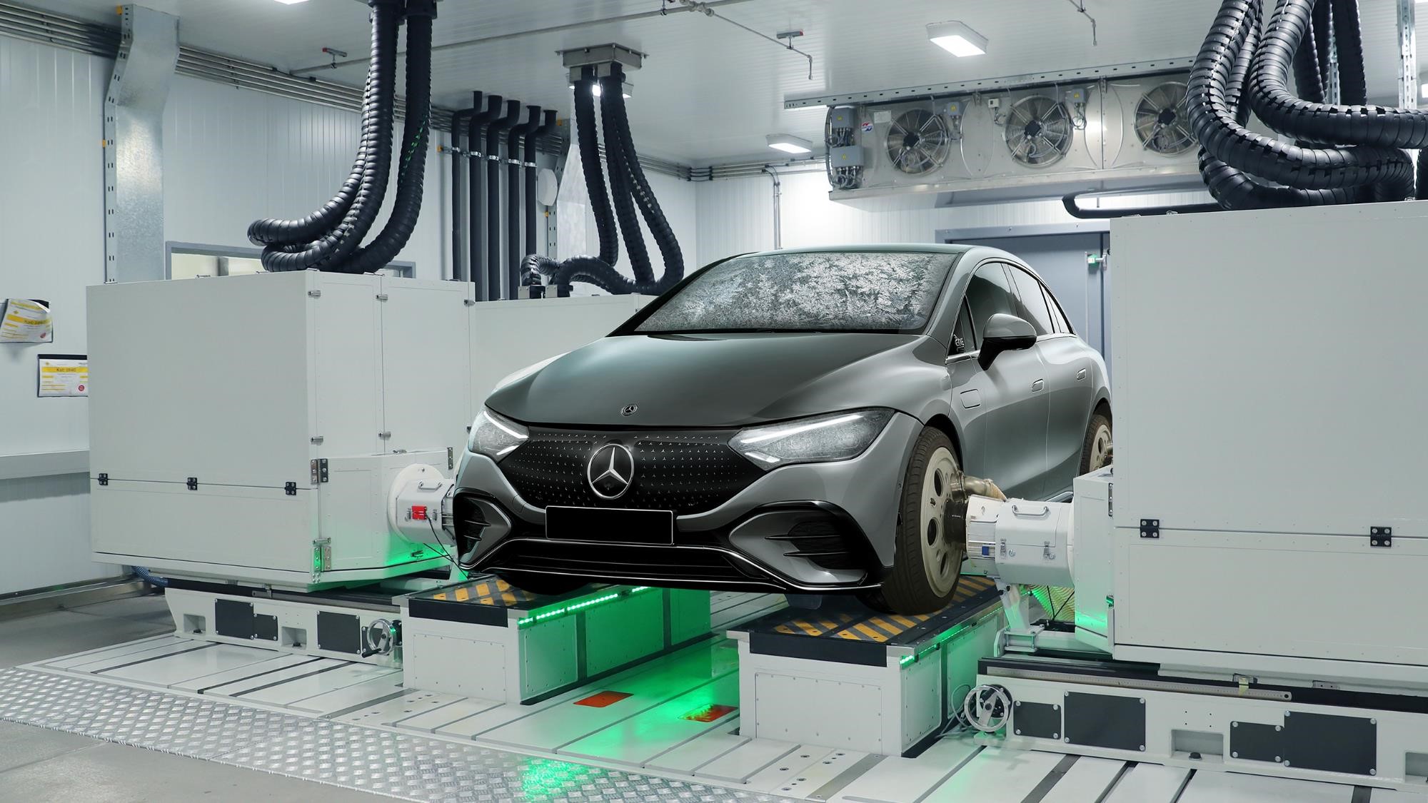 在界面新闻记者参观的过程中,一台奔驰EQE轿车正在电驱试验室里进行零下30度极端温度下的整车验证测试。