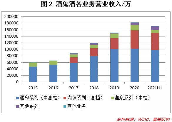 酒鬼酒在2004年就已经用内参系列布局高端酒市场,但一直到2018年内参的营收也仅为2.4亿。2018年底,湖南内参销售有限责任公司开始运作,内参的增长也带动了酒鬼系列的销售,2019年经销商数量是528家,2020年增加至763家,2021年上半年突破1050家,公司的渠道开拓保持高速增长。