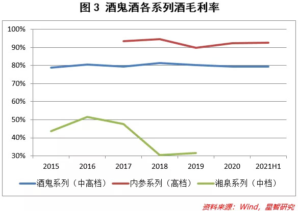 酒鬼酒的营业收入由2015年的6亿元上升至2020年的18.3亿,突破2012年的高点。2021年上半年更是实现17.1亿的营收,与去年全年相差不大。分结构来看(见图3),定位高档的内参酒毛利率基本稳定在90%以上,次高端的酒鬼系列毛利在80%左右,而中低档的湘泉系列,毛利逐年下降至30%左右。内参系列的营收占比由2017年的20%上升至近期的30%,酒鬼系列的同期占比由66%下降至57%,湘泉系列萎缩至5%,中低档市场成为酒鬼酒的弃子,使得酒鬼酒的综合毛利率不断抬升。由此可见,酒鬼酒当前的品牌结构不断优化升级。