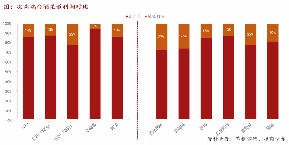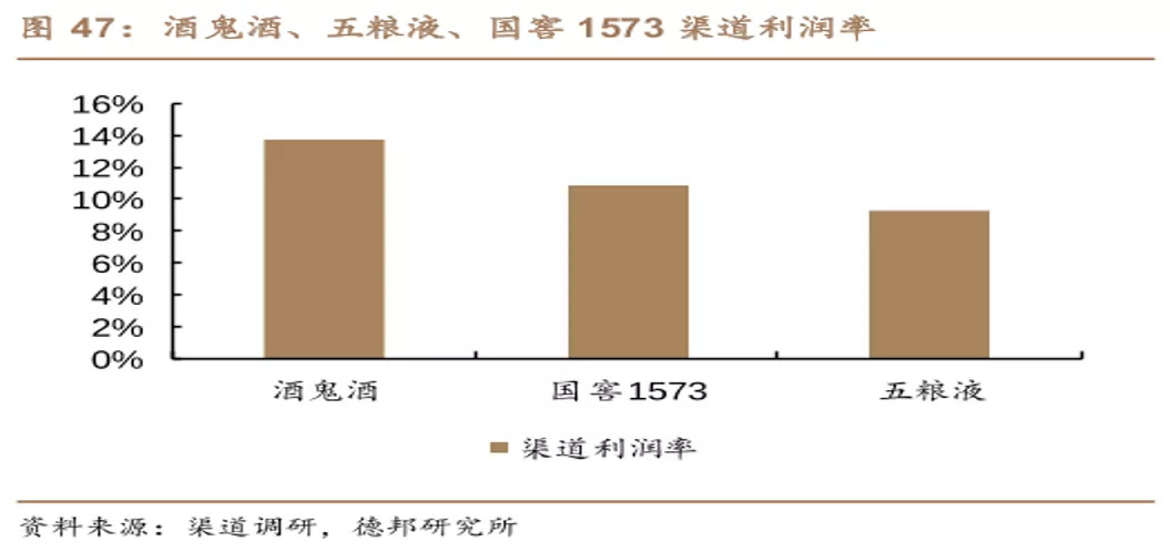 就一线品牌“茅五泸”来说,茅台出厂价969元,市场终端零售价按2700—3000元计算,渠道利润率在179%—210%之间。对于五粮液和泸州老窖。据德邦证券和招商证券研究结果显示,国窖1573渠道利润率位于10%—12%之间,五粮液则在8%—10%。