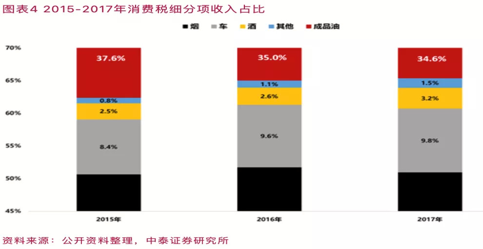 2017年,烟占比约51%,成品油占比约35%,车占比约10%,酒占比约3%,其余占比约1%。(由于财政部后来不公布细分数据,所以2018—2020年数据缺失)