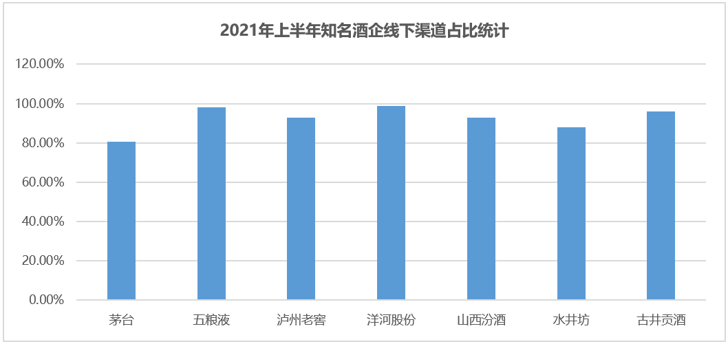 白酒行业作为传统行业,渠道营销在行业营销体系中占有重要地位。从今年上半年对各知名酒企线下渠道统计可以看出,各酒企线下渠道占比普遍都在80%以上,五粮液、泸州老窖、洋河股份、古井贡酒、山西汾酒占比已经超过了90%,洋河股份最高,达98.76%!