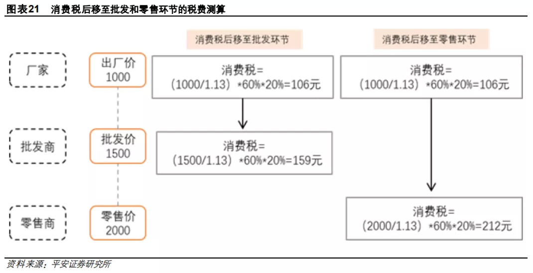 征税后移至批发环节则消费税提升至159元,提升幅度达50%;提升至零售环节则消费税提升至212元,相较于原来提升幅度达100%!