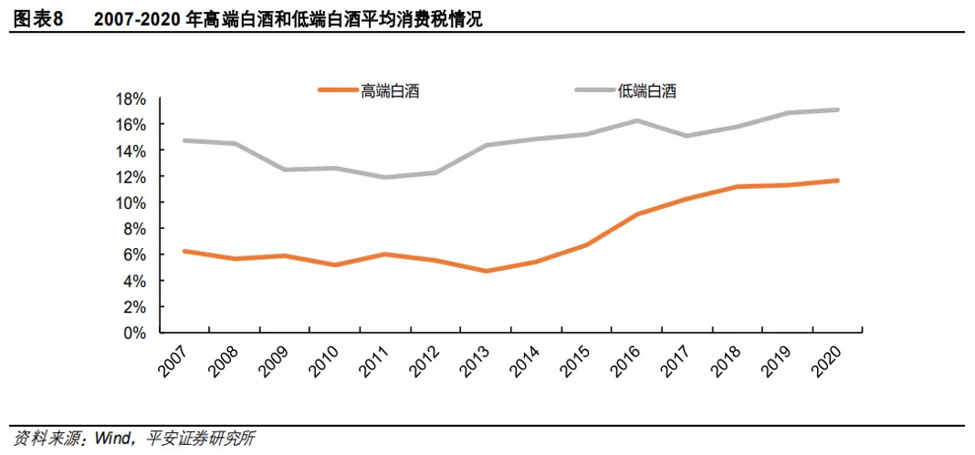 从历史数据来看,白酒上市公司的平均税率也呈不断上升趋势,这与近年来行业不断提价有关。据平安证券统计,从2007年到2020年,白酒上市公司消费税平均税率从10%提升到13.8%。
