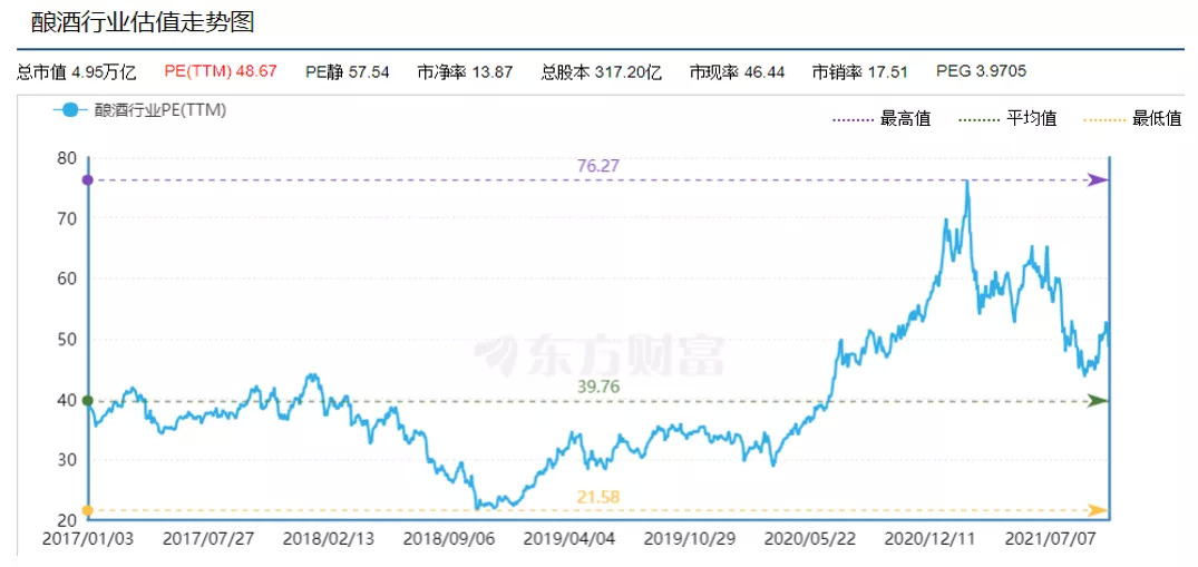 从板块估值上看,据东方财富估值数据显示,截至10月18日盘后,白酒板块整体动态市盈率估值为48.67倍,仍处于行业平均值39.76倍的上方。
