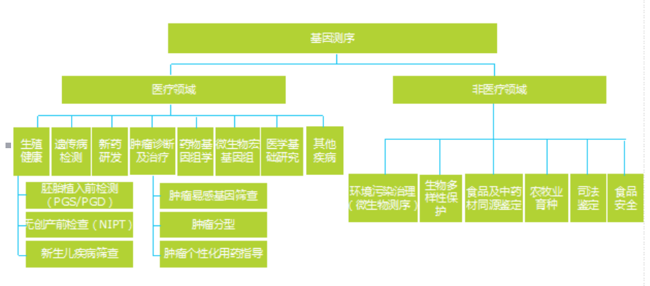 基因测序目前可以应用于医疗领域和非医疗领域。医疗领域的应用领域主要有生殖健康、遗传病检测、新药物研发、肿瘤诊断及医疗、心血管疾病以及医学基础研究,其中生殖健康、肿瘤诊断及医疗、新药物研发和医学基础研究是目前最主要的应用领域。