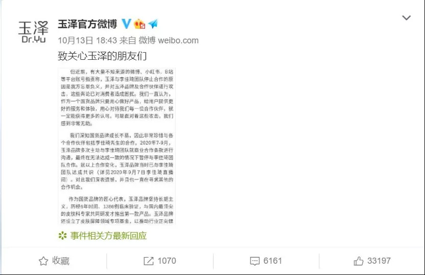 终于,在2020年7月,敏感的消费者发现,李佳琦的直播间逐渐没有了玉泽的产品。如果仅仅是不在李佳琦直播间做投放,玉泽根本不会被推上舆论的风口浪尖,更不会在双十一这个重要节点下发布一则声明。