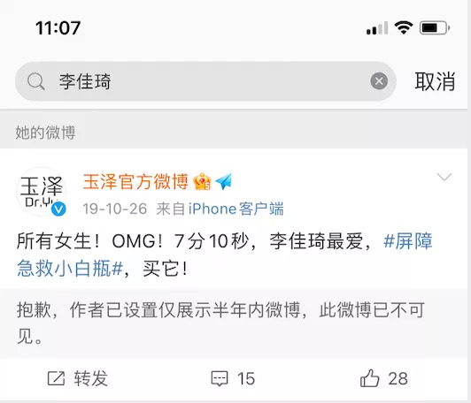 在当时,迫切想出圈的玉泽开始频繁跟李佳琦互动。在玉泽官方微博搜索“李佳琦关键词”,还能看到2019年10月26日玉泽与李佳琦的一条互动微博。