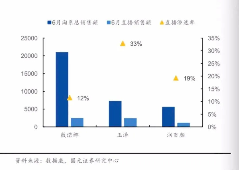 与此同时,玉泽2020年也开始追加直播渠道的投放力度。国元证券数据显示,2020年6月,玉泽的直播渗透率达到了33%,比同样主打修复抗敏的薇诺娜高出了21%。