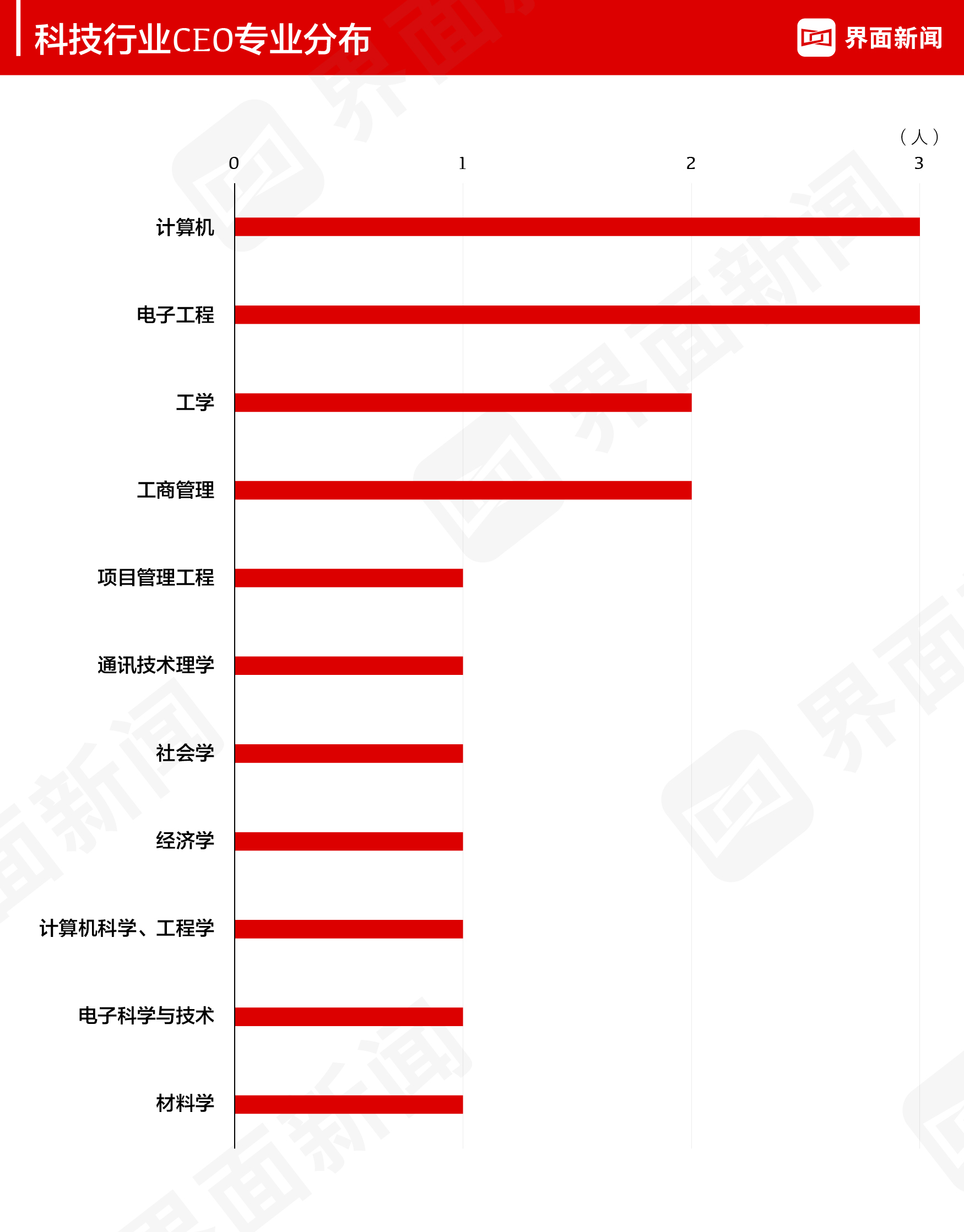 在25位上榜的CEO中有23位公开了自己的学历,硕士和博士分别有9位和8位;有17位公开了毕业的专业,大部分皆与科技或管理相关,仅有一位CEO从社会学成功跨界科技行业,完成华丽转身。