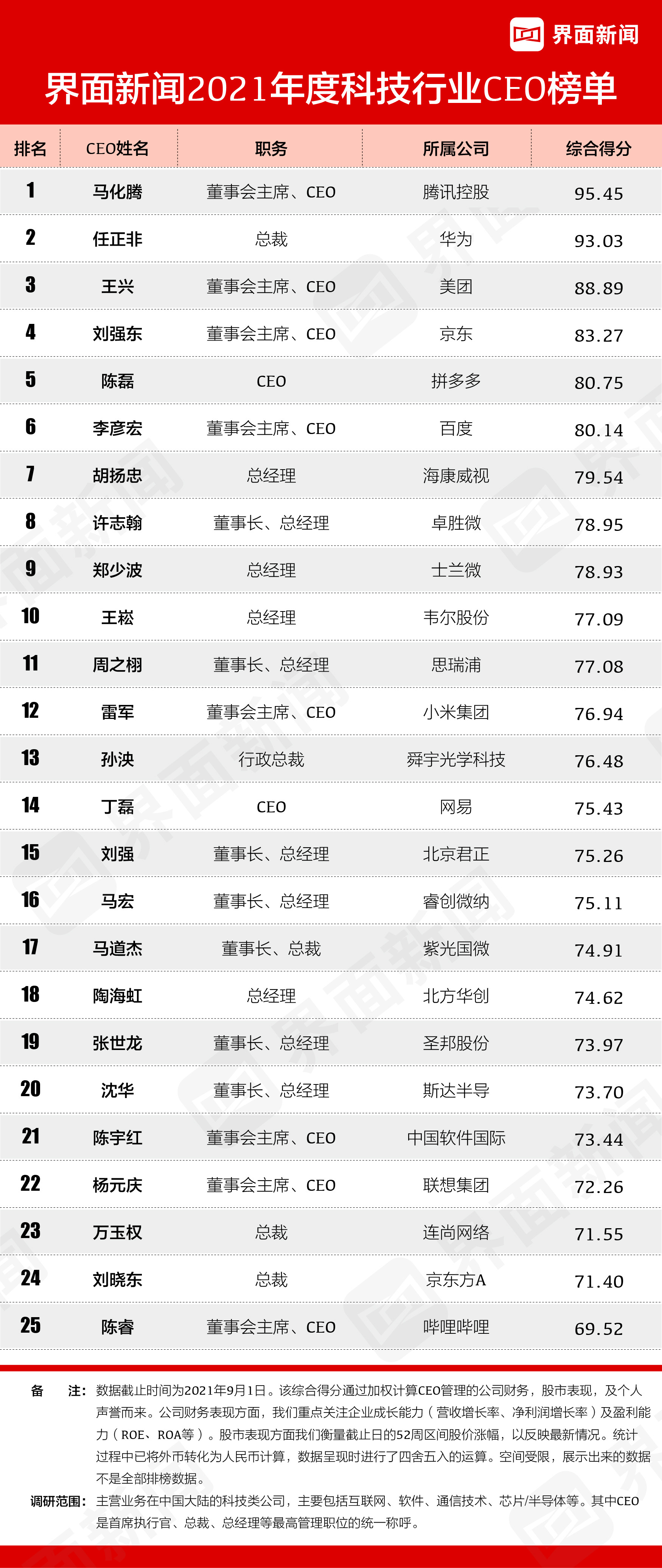 年度科技行业CEO榜单是「界面新闻2021年度超级CEO」系列的子榜单之一。“科技兴则民族兴,科技强则国家强”,一个国家的科技实力是一个国家综合国力的重要组成内容,是一个国家提高竞争力的重要表现。在建设科技强国的背景下,入选界面新闻2021年度科技行业CEO榜单的25位CEO带领企业巩固位置、稳步成长,表现非凡。