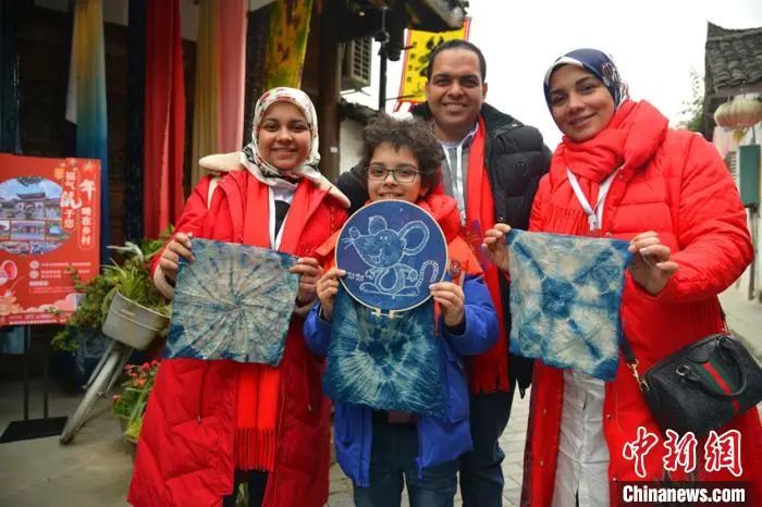 来自埃及的Abdelfatah Abomohra一家人展示亲手制作的中国传统杂染作品。苗志勇 摄