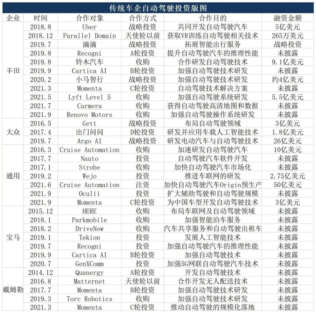 相比较而言,传统车企在自动驾驶技术落地、商业模式方面已处于落后状态。为抢占竞争制高点,传统车企采取了“两条腿”走路的策略:一是自研或成立独立子公司开展自动驾驶业务,但由于产品更迭相对保守、体制难以突破等问题,短期内成效并不明显。二是通过投资、收购自动驾驶初创企业获取相关技术,加快移植“互联网基因”,目前这一途径正在成为主流趋势。即便是用户印象中较为保守的丰田,其在自动驾驶领域的投资金额也在20亿美元以上,而大众的投资金额已超过30亿美元,通用汽车则超过了60亿美元。